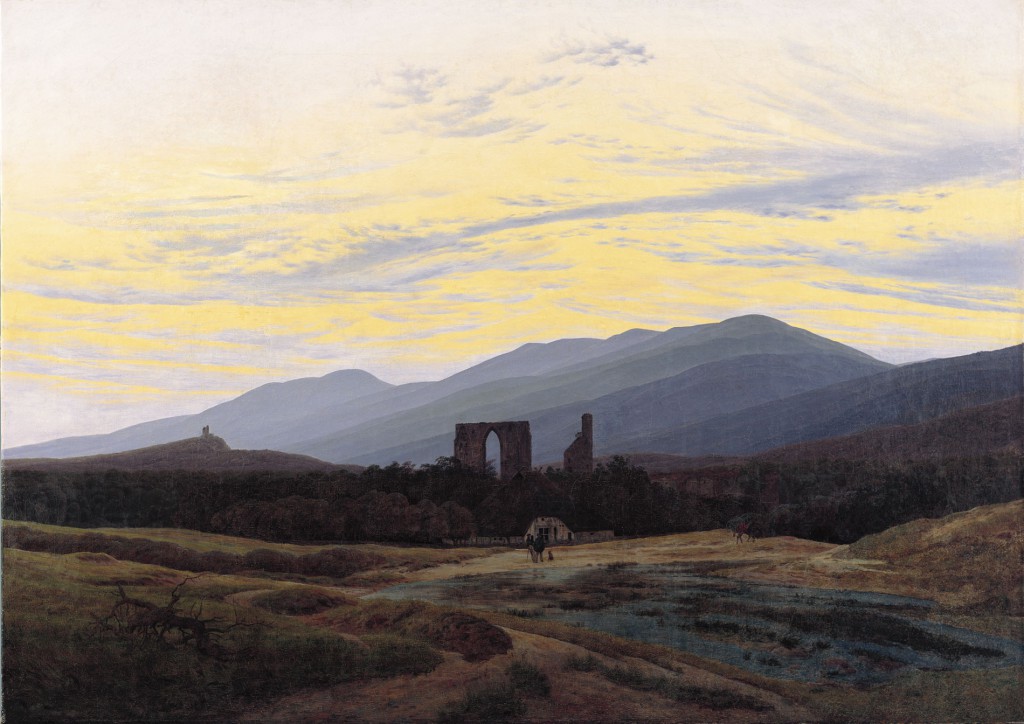 Zu den Hauptwerken im Romantikersaal gehört Caspar David Friedrichs „Ruine Eldena im Riesengebirge“ von 1830/34, neben dem künftig die Eldena-Ansicht von Carus hängen wird. Carus wie Friedrich zeigen das seit dem Dreißigjährigen Krieg ruinöse Zisterzienserkloster, das nur wenige Kilometer vom Greifswalder Stadtzentrum entfernt im Mündungsgebiet des Flusses Ryck liegt, mit Blick auf die markante Westfassade der Klosterkirche. Friedrich setzt das Monument norddeutscher Backsteingotik vor die – seitenverkehrt gegebenen – majestätischen Gipfel des Riesengebirges in Schlesien. Doch die architektonische Gestalt der Ruine gibt der Künstler detailgenau wieder – bis auf das große Westfenster, das damals noch weitgehend vermauert gewesen ist. In Kompositionen wie dieser dient Friedrichs Detailrealismus einer höheren Wirklichkeit. Auch Carl Gustav Carus entfernt sich in seinem Gemälde weit vom realen Zustand der Klosterruine, für die sich in den Jahren um 1820 patriotische Bürger ebenso zu interessieren begannen wie der geschichtsbewusste preußische Kronprinz. In seinen Lebenserinnerungen berichtet Carus vom ersten Eindruck, den die backsteinroten Baumassen auf die Freunde machten: „Die Krone des Tages war ein Abendspaziergang am Ryckgraben, der Mündung des Hafens, hinaus nach Eldena, wo eine der malerischsten Klosterruinen, ein einsames umbuschtes hochgothisches Fenster mit starken Pfeilern, kühn sich hervorhob, und nebst einem sich anlehnenden Hüttchen, im Hintergrunde das Meer bei spätem Abendduft eins der reizendsten Bilder darstellte, die bis dahin mir vorgekommen waren.“