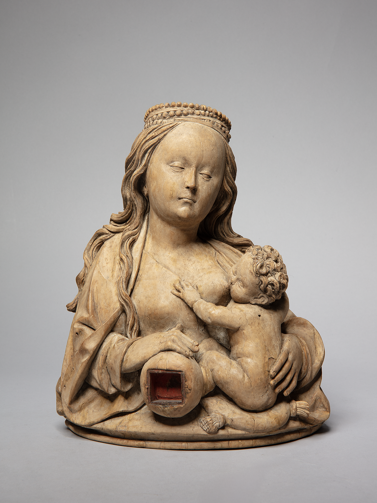 Bei der um 1510/20 entstandenen vollrund geschnitzten Skulptur der stillenden Jungfrau Maria mit dem Jesuskind handelt es sich um ein Büstenreliquiar. Dieses diente der Aufbewahrung und Verehrung von Reliquien in der privaten Andacht. Stilistisch lässt sich die Entstehung der Büste in Ulm verorten, eines der führenden Zentren spätgotischer Bildschnitzerkunst. Charakteristisch sind die lebendige Ausgestaltung der Haare und das idealisierte, fein gestaltete Gesicht. Mit großer Wahrscheinlichkeit war die Büste ursprünglich vergoldet. Fein gearbeitete Details wie die verrutschte Kette am Kronreif der Maria und die weiche Ausgestaltung der Falten ihres Gewandes zeugen von der besonderen Qualität der Arbeit.