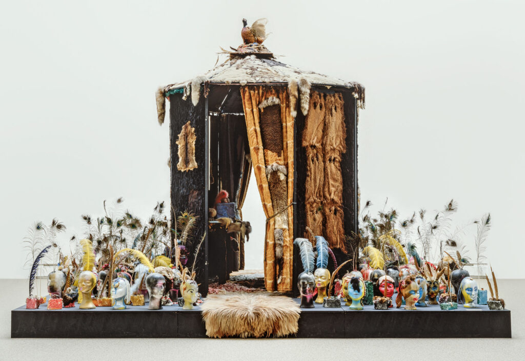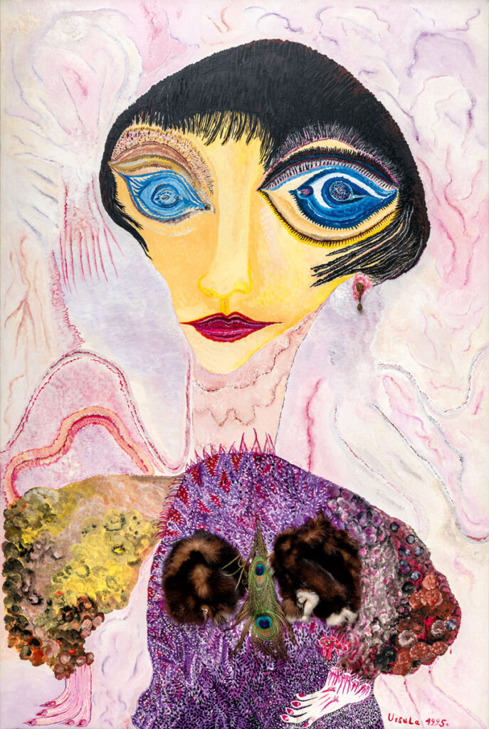 Souverän integrierte die Künstlerin Textilien in ihre Gemälde, besonders gern arbeitete sie – heute fast anstößig – mit Pelzen. Diederich vermutet angesichts der sonst kaum zu bewältigenden Kosten, sie müsse Kürschner-Restbestände aufgekauft haben. Unschuldig sind die Pelzarrangements indes nicht, immer wieder hat Ursula Rasierklingen eingenäht. Eines der zentralen Stücke der Ausstellung ist das „Ursula-Pelz-Haus“ (1970), eine atmosphärische Installation mit ethnographischen Obertönen, die an eine nomadische Behausung ebenso denken lässt wie an ein hierarchisches, möglicherweise koloniales Setting, denn umringt respektive bewacht wird das Haus von einer ganzen Schar bunt bemalter Styroporköpfe mit aufgestecktem Federschmuck. Klar unterscheidbar aber ist auch hier das Indigene nicht vom Exogenen. Beides kommt quasi als Endogenes zusammen, denn das Pelz-Haus ist bis in seine Details eben auch Ausfluss der träumerischen Phantasie der weitgereisten Künstlerin und damit so etwas wie ihre persönliche Metamorphose, ein Alter Ego als schwereloses Haus oder groteskes Tier.