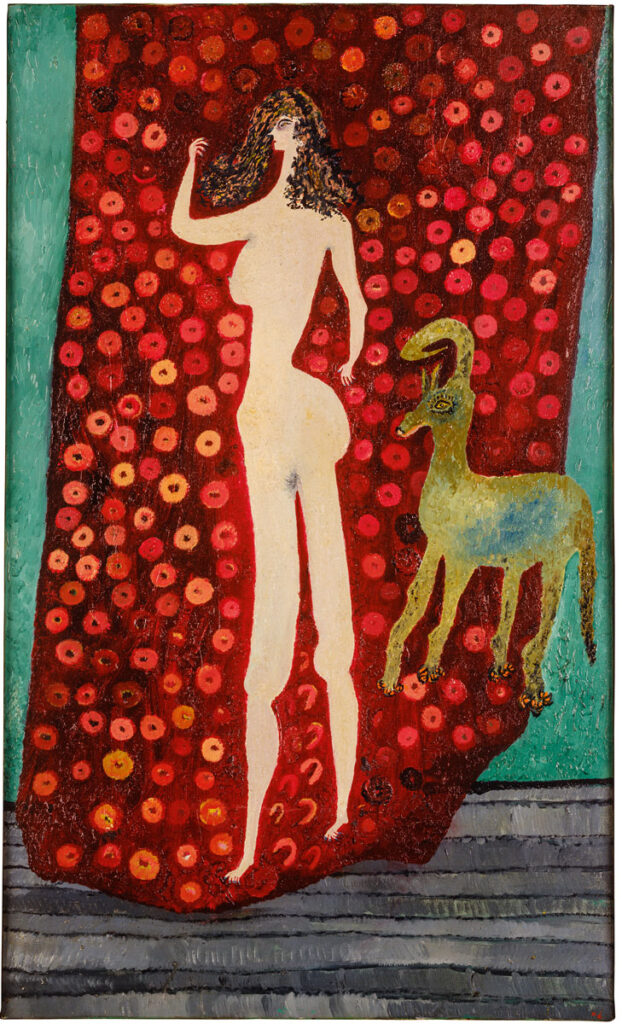 Auch thematisch sind in der Frühphase bereits die meisten späteren Motive vorgeprägt: das ambivalent Märchenhafte, die Beziehungsgeflechte, das Augenmotiv (Grenze von Innen- und Außenwelt) oder das Spiel mit dem Mythos, hier mittelalterlich gewendet („Mädchen und Einhorn“, 1957). Aufgrund der Konstanz der Motive in Ursulas Gesamtwerk sei die Ausstellung im Weiteren nicht chronologisch aufgebaut, erklärt Stephan Diederich. Sie folgt eher intuitiven Kapiteln wie „Nacht-Mahre“, „Mit Augenfühlern“ oder „Vögel im Paradiesgarten“. Die oft über den Bildrand hinauswachsenden Motive verweben die Gemälde, wie in der Zusammenschau sehr schön sichtbar wird, zu einer einzigen großen Textur. Es geht also weniger um das abgeschlossene Sujet als um das Entstehen einer ganzen Gegenwelt der individuellen Phantasie, einer Seelenlandschaft.