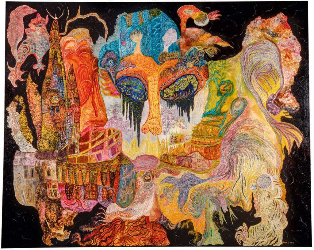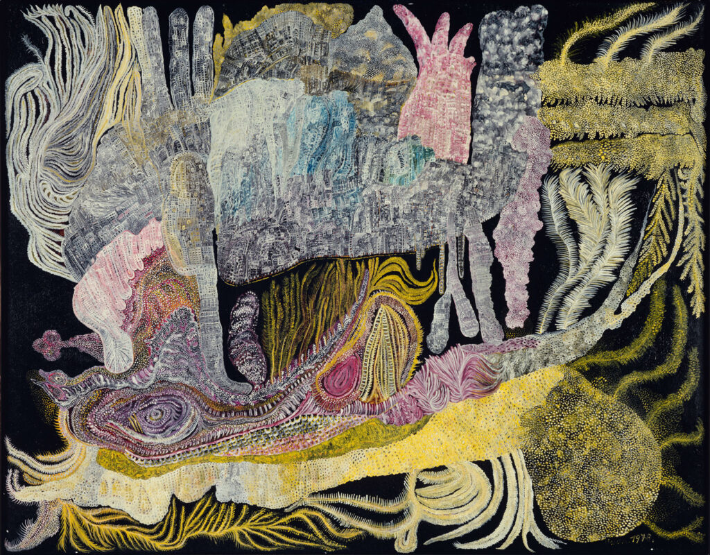 Dem Erlebnis der faszinierend vielgestaltigen Bildwelt Ursulas mit ihren organisch überbordenden Strukturen, rauschhaften Farben und allgegenwärtigen Metamorphosen kommt vielleicht nur die Verzauberung gleich, die einen beim Eintauchen in ein Korallenriff erfasst. Die Kölner Ausstellung versetzt die Besucherinnen und Besucher in einen ähnlichen Schwebezustand, zumal es beim Eintauchen ins Ursula-Riff sogar einige Stufen hinabzusteigen gibt. Sogleich nehmen einen die Arbeiten aus den fünfziger Jahren, der künstlerischen Findungsphase, gefangen. Die Bilder zeigen surreale Gestalten („Polypen unter sich“, 1959), biegsame Dämonen, Gespenster in Netzstrukturen, in Verwandlung begriffene Frauen („La belle et la bête“, 1955), aber auch durchaus traditionelle Figuren. Hier und da ist das noch flächig gemalt, weist aber oft auch schon die für Ursula typischen feinen Punktmuster, verzahnten Strichelstrukturen und rhizomatisch wuchernden Tentakel auf.
