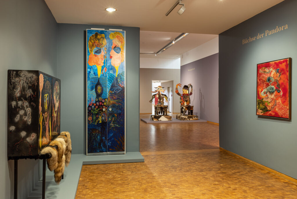 Lange als „naiv“ qualifiziert, repräsentieren die Werke Ursulas vielmehr eine ureigene Spielart des Surrealismus. Sie atmen Freiheit in jedem Sinne, ganz zentral auch eine Freiheit von den Konventionen, Schulen und Regeln der akademischen Kunst. Offen zeigte sich die Künstlerin ebenso gegenüber den Materialien, ohne diese Offenheit programmatisch zu überhöhen. Sie bemalte Wächterfiguren aus Holz, kreierte einen Mann-Stuhl (1990) wie einen Frau-Stuhl (1990/91), die bei allen Geschlechterklischees doch wie ein Team wirken, nicht wie Gegner. Unermüdlich bemalte und dekorierte sie verlockende Wunderschränke, benannt nach Pandora, jener aus Lehm geformten Frau, die als Inkarnation der Unwägbarkeit der Zukunft zu Ursulas Leitmotiv wurde. Die Schränke erinnern an aufklappbare Puppentheater, bilden Pforten ins Innenreich der Phantasie. Pandoras Büchse ist damit kein Menetekel mehr, sondern eine bewohnbare Wunderkammer vor aller Trennung von Hoffnung und Verzweiflung.